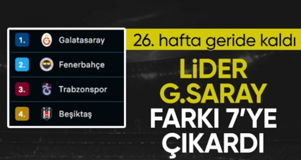 Ligde 26. haftanın perdesi kapandı. Haftayı galibiyetle tamamlayan Galatasaray, puanını 64’e çıkardı ve liderliğini sürdürdü. Fenerbahçe ise bu sezon ligde ilk yenilgisini yaşadı.